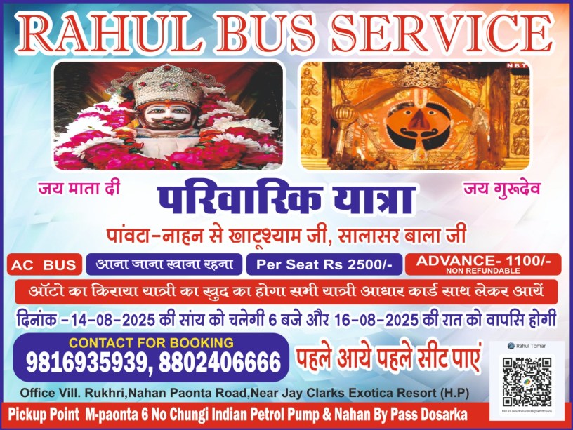 рд░рд╛рд╣реБрд▓ рдмрд╕ рд╕рд░реНрд╡рд┐рд╕ рдЗрд╕ рдмрд╛рд░ рдлрд┐рд░ рд╕реЗ рдПрдХ рдпрд╛рджрдЧрд╛рд░ рднрдХреНрддрд┐ рдпрд╛рддреНрд░рд╛ рдХрд╛ рдЖрдпреЛрдЬрди рдХрд░ рд░рд╣рд╛ рд╣реИ тАУ рдкрд╛рдВрд╡рдЯрд╛ рд╕рд╛рд╣рд┐рдм рдФрд░ рдирд╛рд╣рди рд╕реЗ рд░рд╛рдЬрд╕реНрдерд╛рди рдХреЗ рдкреНрд░рд╕рд┐рджреНрдз рддреАрд░реНрдерд╕реНрдерд▓реЛрдВ рдЦрд╛рдЯреВрд╢реНрдпрд╛рдо рдЬреА рдФрд░ рд╕рд╛рд▓рд╛рд╕рд░ рдмрд╛рд▓рд╛рдЬреА рддрдХред рдпрд╣ рдпрд╛рддреНрд░рд╛ рдХреЗрд╡рд▓ рддреАрд░реНрде рдирд╣реАрдВ рд╣реИ, рдмрд▓реНрдХрд┐ рдЖрддреНрдорд╛ рдХреА рдкрд╡рд┐рддреНрд░рддрд╛ рдФрд░ рдкрд░рд┐рд╡рд╛рд░ рдХреЗ рд╕рд╛рде рдмрд┐рддрд╛рдП рдЬрд╛рдиреЗ рд╡рд╛рд▓реЗ рдЙрди рдЕрджреНрднреБрдд рдкрд▓реЛрдВ рдХрд╛ рд╕рдВрдЧрдо рд╣реИ, рдЬреЛ рдЬреАрд╡рди рднрд░ рд╕реНрдореГрддрд┐ рдореЗрдВ рдмрд╕ рдЬрд╛рддреЗ рд╣реИрдВред